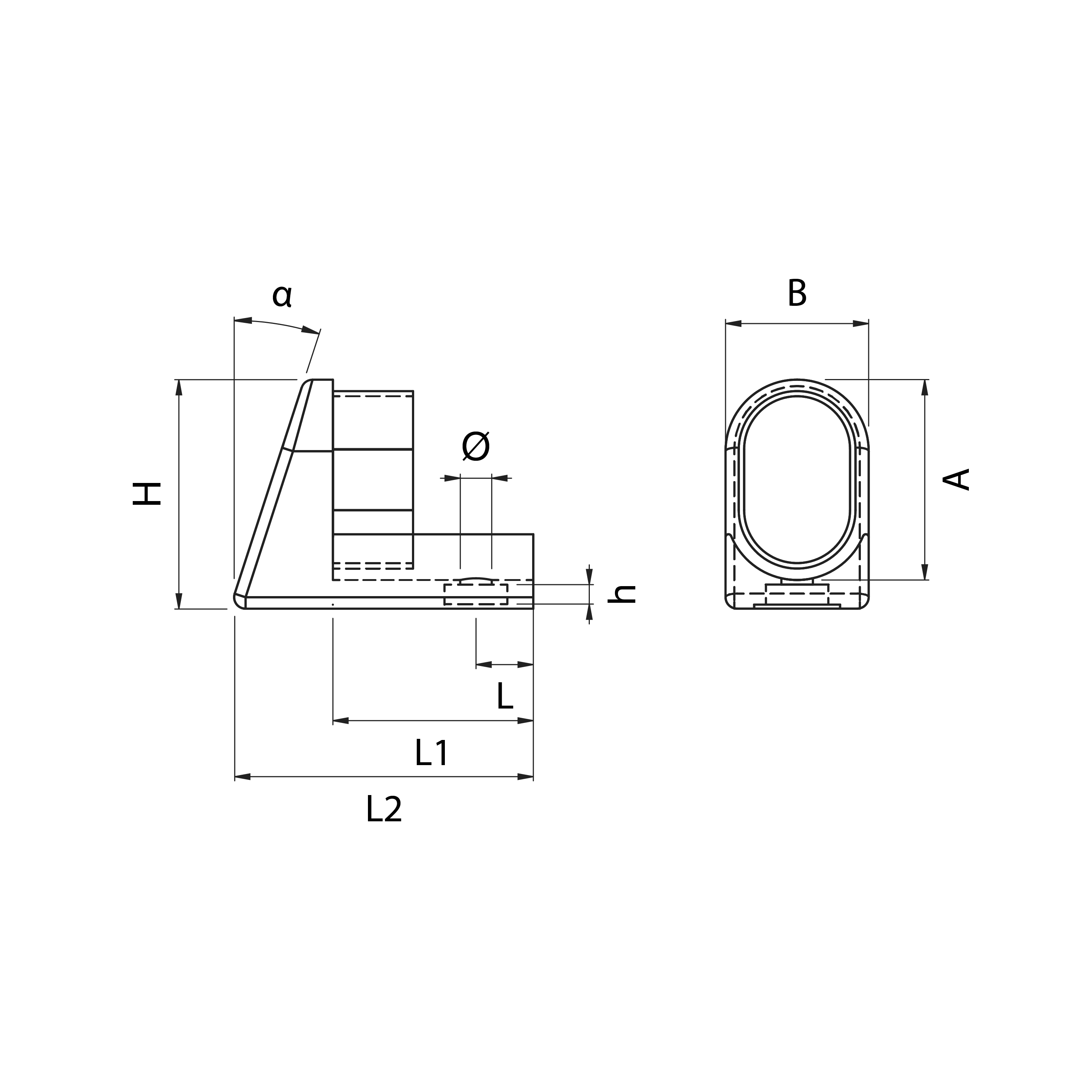 A (mm) = 50; B (mm) = 30; H (mm) = 56; h (mm) = 5; L (mm) = 10; L1 (mm) = 35; L2 (mm) = 55; Kot (°) = 11