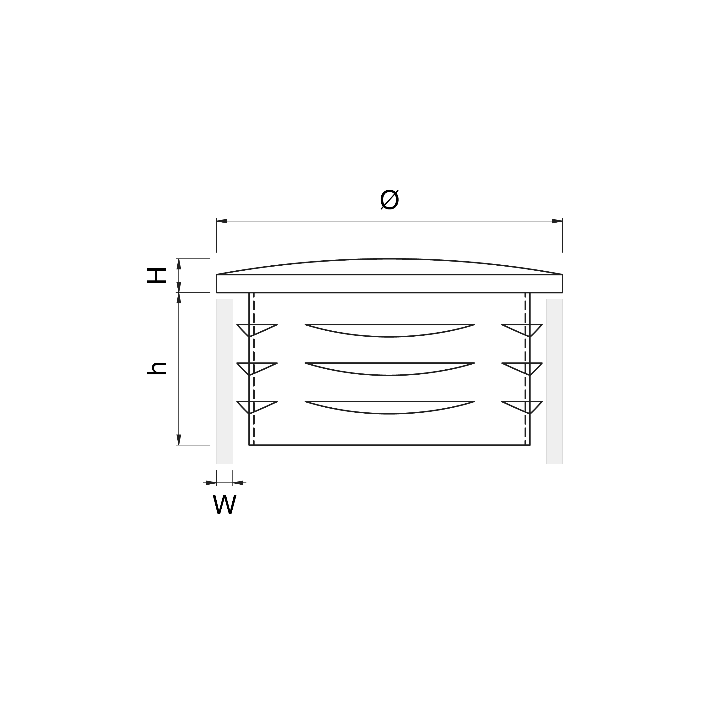 fi (mm) = 25; W = 1,5 – 2,0; H (mm) = 3; h (mm) = 15